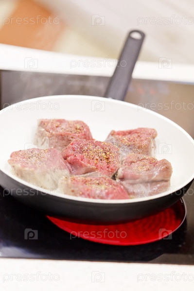 Мясо жарится на сковродке
