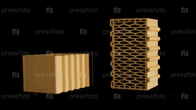 Два новых перфорированных красных кирпича помещены на черную стойку, концепцию строительства и стройматериалов