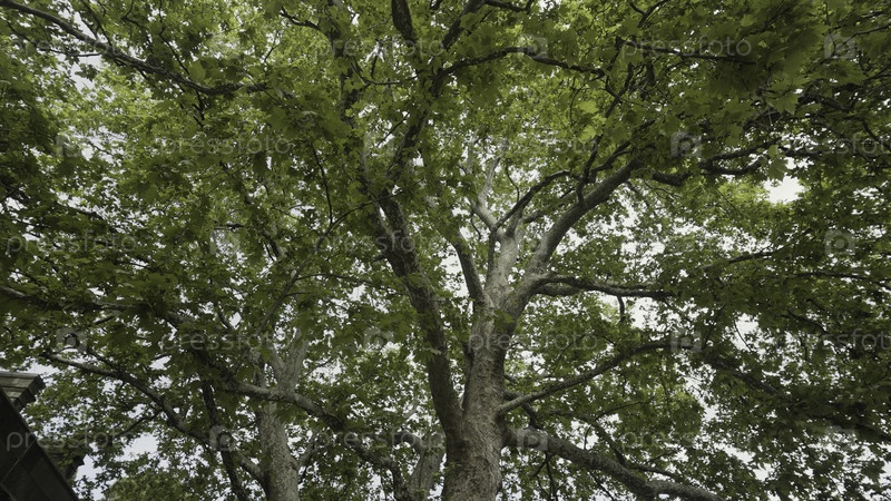 Прогулка под летним деревом. Идите дальше. Ниже виден ствол и большие ветви с пышными зелеными листьями на фоне облачного неба