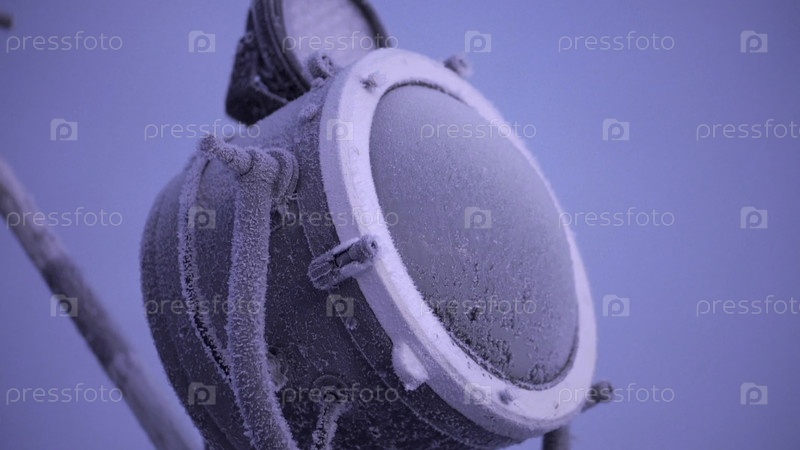 Яркий замороженный фонарик. голубое небо и яркий большой фонарь, покрытый льдом от холодного и светлого неба. высококачественный персонал FullHD