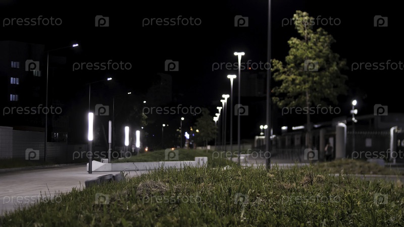 Мужчина идет по зеленой аллее в городском парке возле ярких уличных фонарей