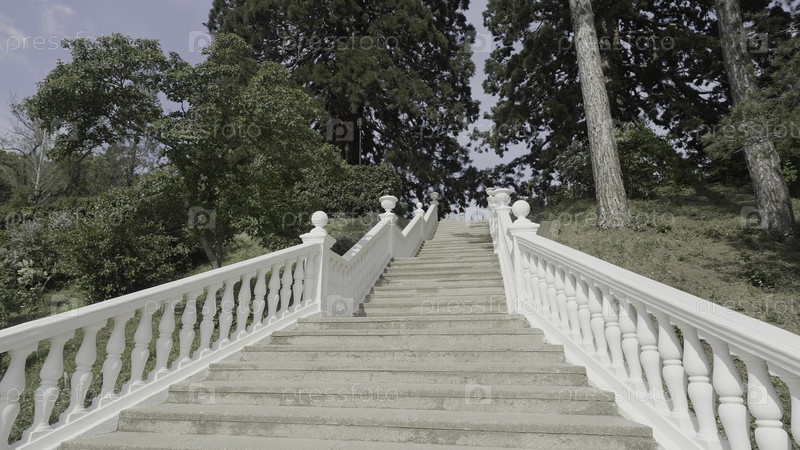 Нижний вид красивой лестницы, ведущей к зеленым деревьям