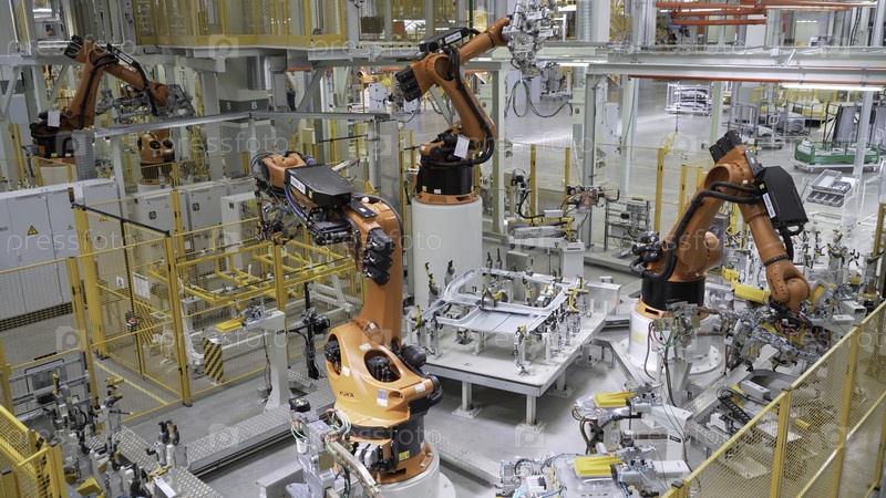 Москва - Россия, 05.05.2022: роботизированные руки работают на современной фабрике. Сцена. Вид внутрь мастерской с оборудованием, промышленный фон, эффект расширения времени