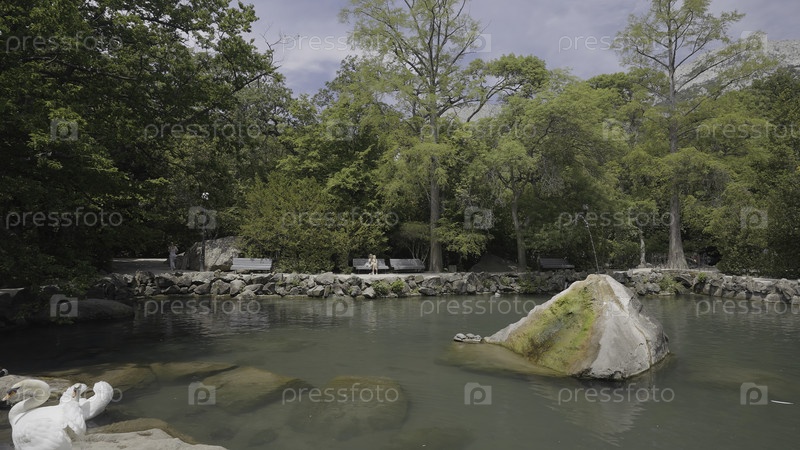 Парковый пруд с лебедями в солнечный день.Пойдите дальше.Маленький водоем в зеленом парке со львами.Красивое озеро со львами и отдыхающие люди на скамейках