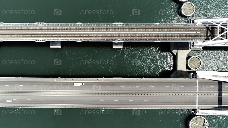 Летний вид с вертолёта. Идите вперед. Огромный мост для движущихся автомобилей, построенный высоко над морем и голубым дневным небом. Высококачественная запись 4k