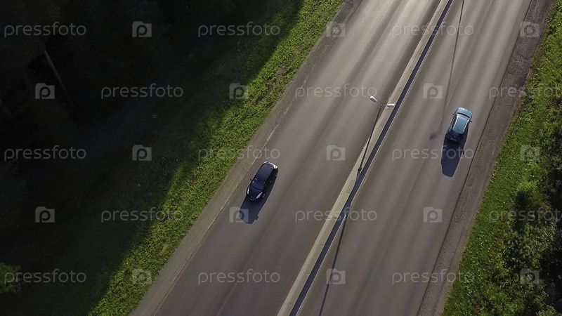 Вид черной машины, едущей по лесомагистрали. Клип. Отслеживание автомобиля, движущегося по трассе на фоне зеленого леса. Путешествие на машине по лесному шоссе в солнечный летний день
