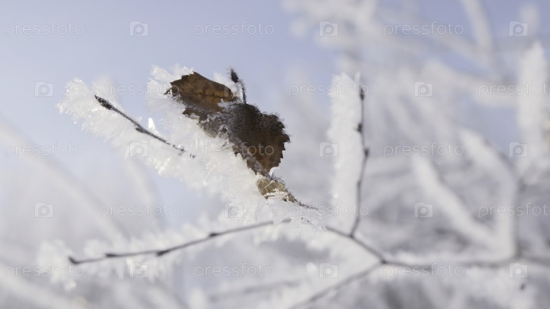 Закрытие красивой ветви дерева на холоде.Креативно.Древесная ветка покрыта морозом.Зимние заморозки на ветвях деревьев в солнечный день