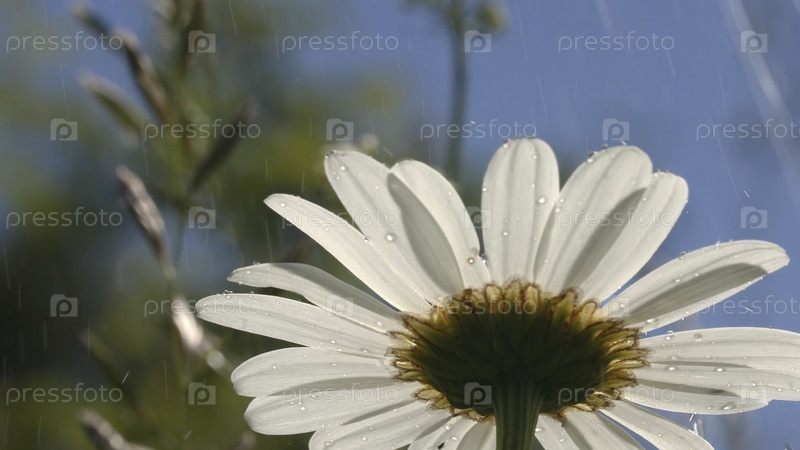 Красивые ромашки поливаются в солнечный летний день.Креативное создание. Близкий план красивых ярких ромашек при ярком летном дожде с солнечным днем.Флора и макромир летнего луга