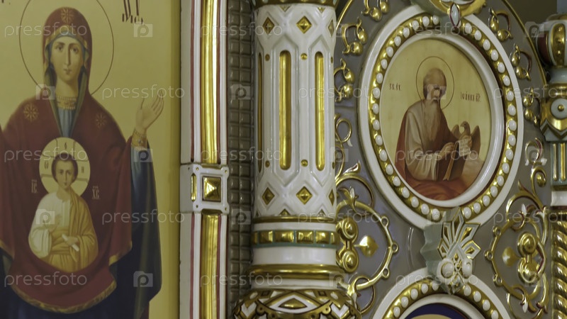 Интерьер декоративной православной церкви с красивой фреской, покрывающей стену иконами, концепцией религии