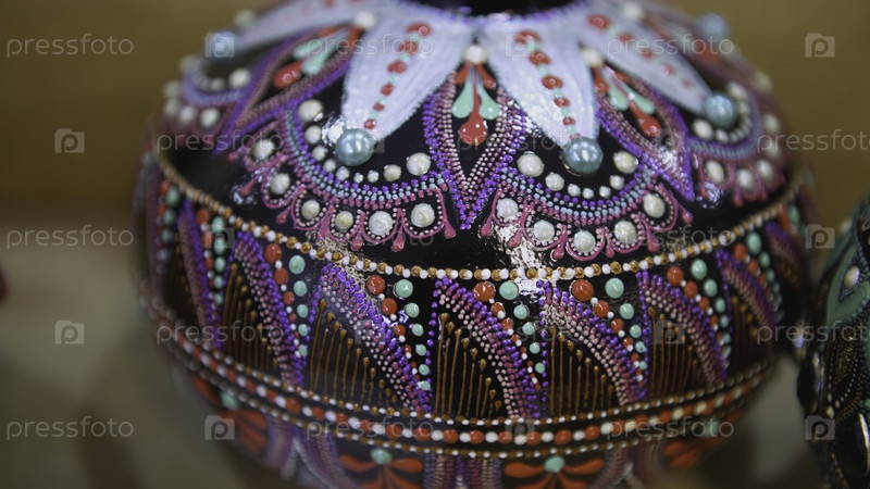 Екатеринбург, Россия - 25 февраля 2022: глиняный горшок, окрашенный в точки. Искусство. Керамическая чаша с многоцветными узорами. Глинистая мандала с мозаичным рисунком на одной стороне