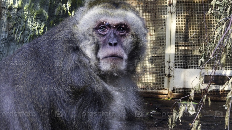 Закройте грустную обезьянку, которая ест пищу и жует в клетке