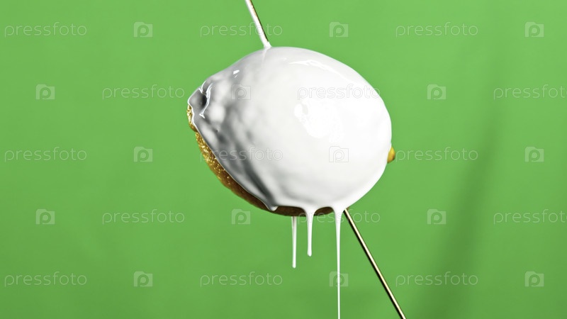 Концепция современного искусства. Клип для акций. Завершение фрукта лимона на деревянном шипце, залитый белой жидкой краской, изолированный на фоне зеленой стены