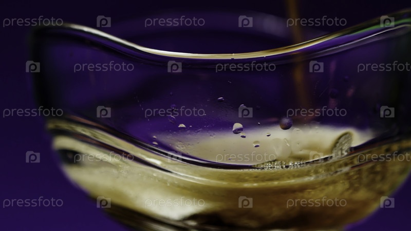 Бармен. аккаунтный клип. фиолетовый освещенный фон с большим просторным стаканом, в который наливают газировку и весь натюрморт украшают светлыми апельсинами