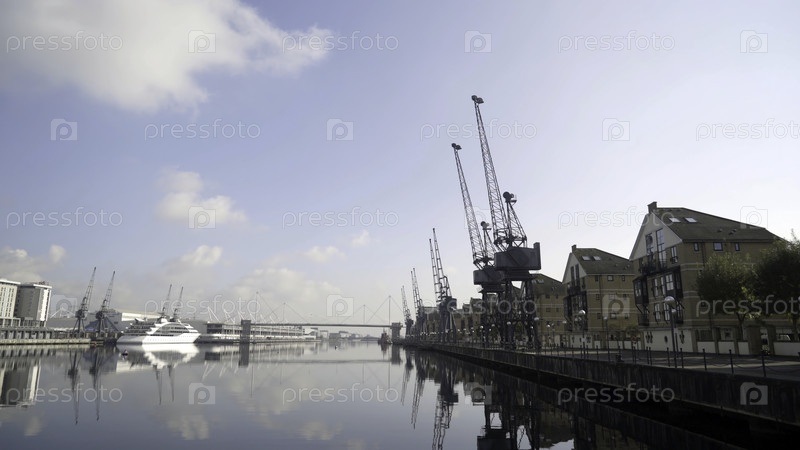 Панорама портового канала с набережной и доками. вперед. красивый портный канал с причалами на фоне европейского города и голубого неба