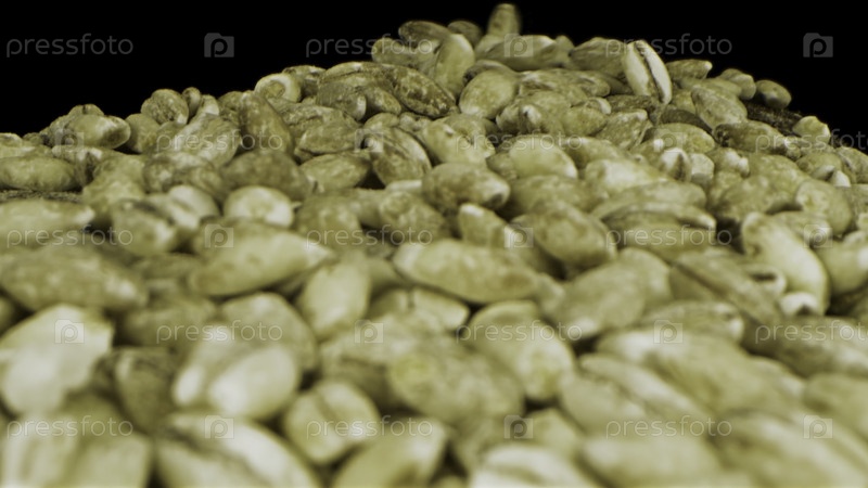 Закройте зеленые кофейные зерна. резервная запись. Не обжаренные арабские кофе, падающие на черный фон, семена для приготовления вкусных горячих напитков