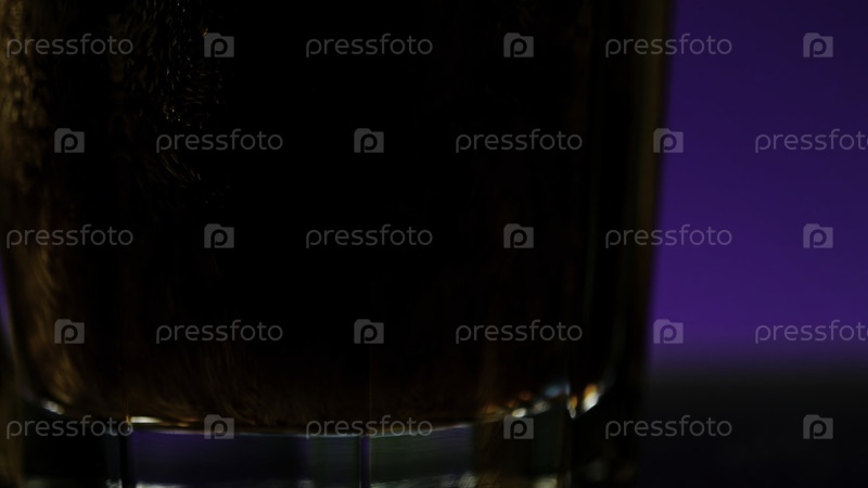 Положите пузырьки кока-колы в стакан, закройте его. Стеклянный клип. Кола сода в прозрачном стекле на красочном освещенном стеновом фоне