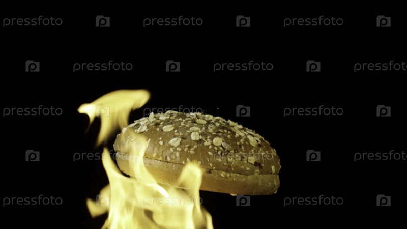 Апетитная булочка с кунжутными семенами, изолированная на черном фоне красным пламенем