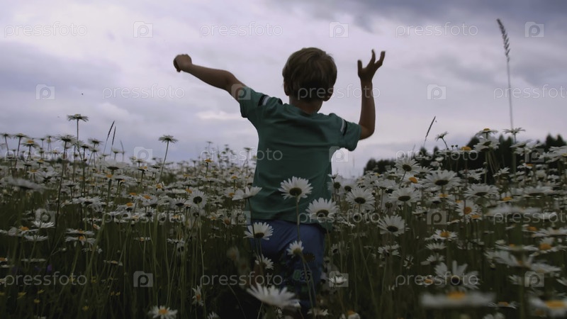 Мальчик бежит по лугу с цветами. творческий. задний вид ребенка, бегающего через поле ромашки. ребенок в синей одежде бегает на высокой траве с маргаритами