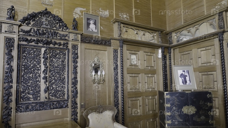 Деревянные красивые старомодные стены с резными вставками, люстрами свечей и картинами