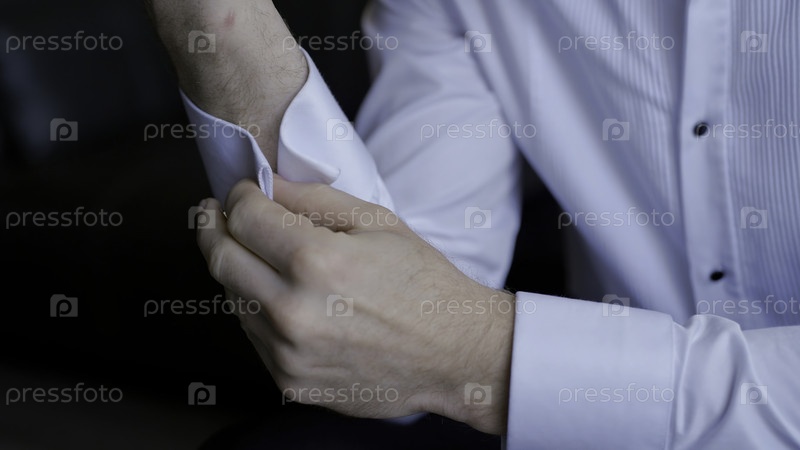 Мужчина одевается и застегивает пуговицы на рукава своей белой рубашки