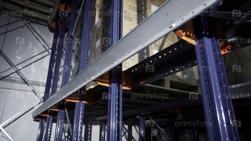 Москва - Россия, 04.20.2022: Хранилищные материалы и металлические полки с товарами внутри картонных коробок. Креативность. Камера перемещается между полочками с разными коробками