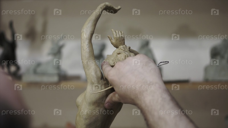 Руки скульптора работают со штукатурной статуэткой.Скульптор тщательно работает на гипсовой статуетке с помощью инструментов скульптора и отдувает хлопчатобумажные крошки