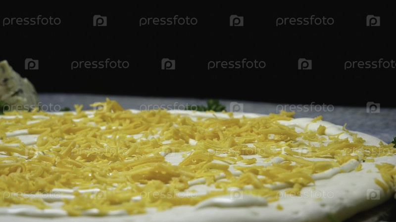 Повар наливает сыр на пиццу. Рамка. Профессиональный шеф-повар итальянской кухни в перчатках заливает обжаренный сыр над сырой пиццей. Приготовление традиционной пиццы на черном изолированном фоне
