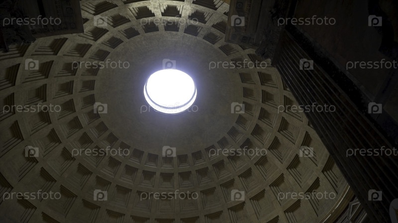 Интерьер храма с куполом из круглого окна и ярким светом, проходящим сквозь него, концепция архитектуры.Сток.Прогулка через массивные церковные двери в круглый зал под куполом