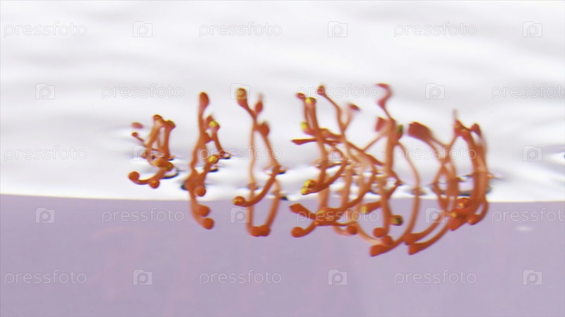Волшебный экзотический цветок нежно погружается в аквариум с водой на розовом фоне. резервные кадры. Концепция природы и весны