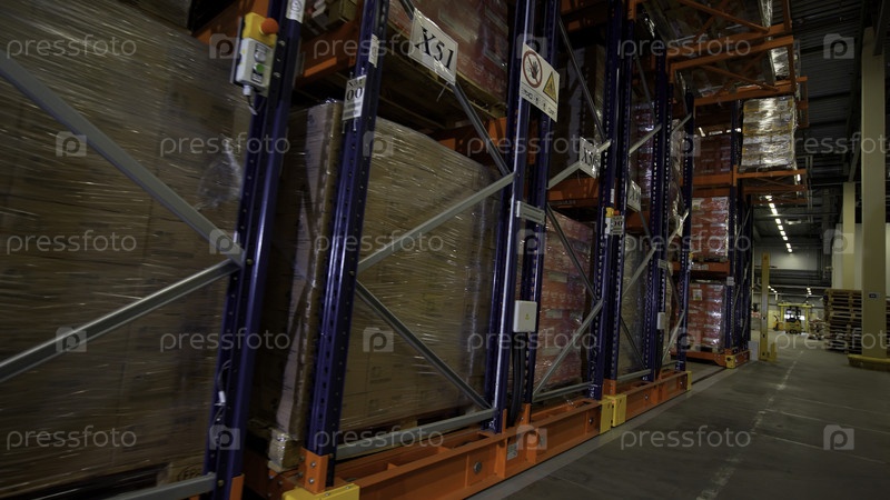 Москва - Россия, 04.20.2022: Хранилищные материалы и металлические полки с товарами внутри картонных коробок. Креативность. Камера перемещается между полочками с разными коробками