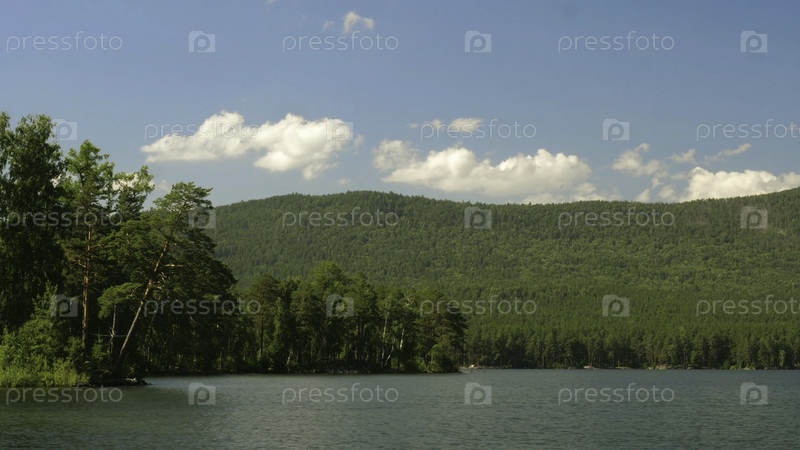 Летний пейзаж с голубым небом, деревьями и озером