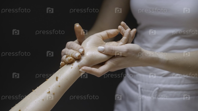 Массажист натирает скреб над рукой. Продолжайте. Нежные движения массажиста по руке клиента. Красивые массажные движения и трение