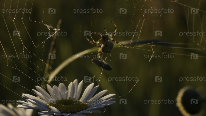 Тонкая паутина.Креативность.Пейзаж с зеленой травой, где вы можете увидеть паука паука паука паук сделал и затем спрятался в ромашке со изогнутыми лепестками