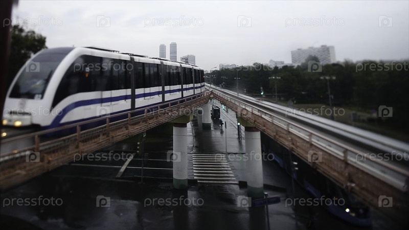 Cinemagraph - Поезд на поднятых рельсах в зданиях на Круговой, стеклянной и стальной мосту между зданиями
