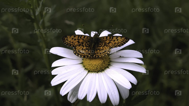 Красиво окрашенная Бабочка опирается на яркий цветок Дейзи, окруженный великолепием природы