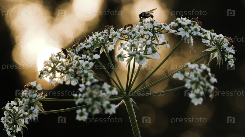 Блоки и муравьи в цветке.Креативно.Маленькие насекомые ползут на маленьком белом цветочке, а за вами видно, что солнце тихо садится