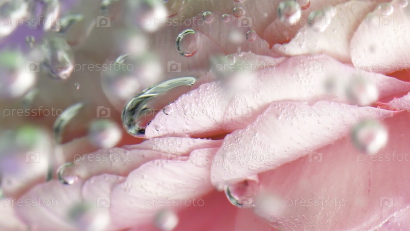 Экстремальное сближение красивых лепестков роз в прозрачной кристаллической воде с пузырями. резервные кадры. Концепция спа-салона и расслабляющего исцеления