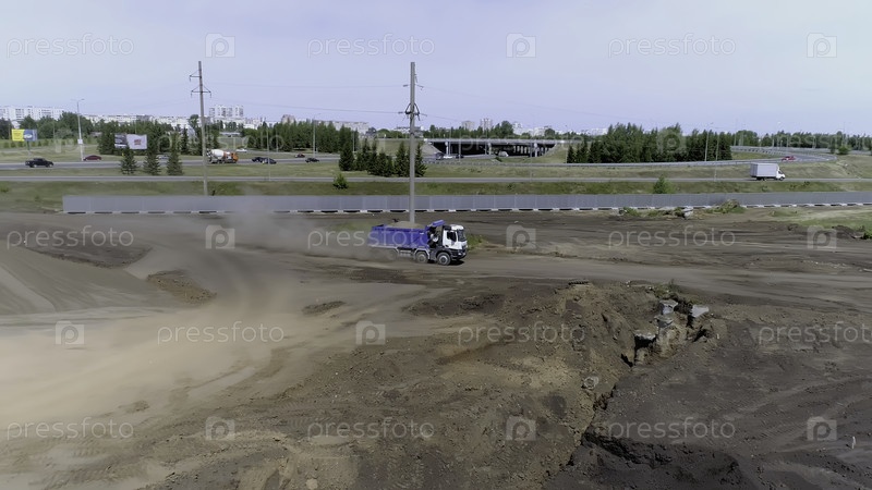 Использование тяжелой техники в строительной отрасли Сцена. Грузовик перемещается по стройплощадке, покрытой песком и гравием