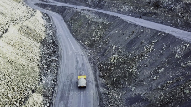 Сверху видно вождение оранжевого грузовика с обломками на открытой дорожной яме Тяжёлый транспорт в горнодобывающей промышленности