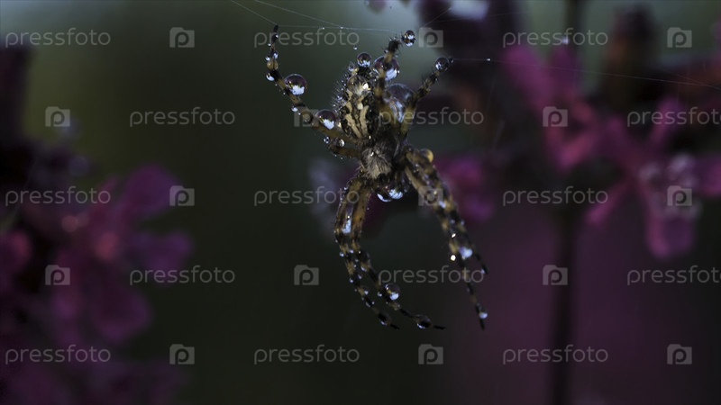 Закрытие паука в паутине каплями.Креативное.Прекрасный паук в паутине с цветами.Пауковые луга в паутине между красивыми цветками