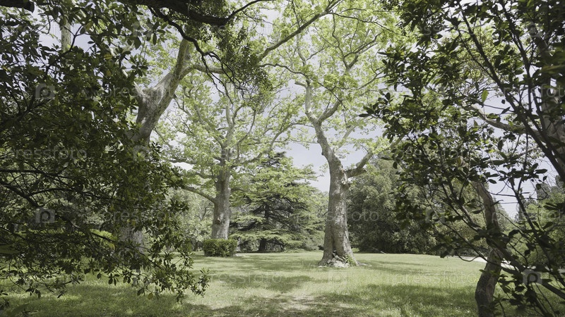 Красивая солнечная поляна в лесу с зелеными деревьями. идите дальше. яркая небольшая поляна посреди зелёного леса. зеленая трава вокруг дерева в парке в солнечный летний день