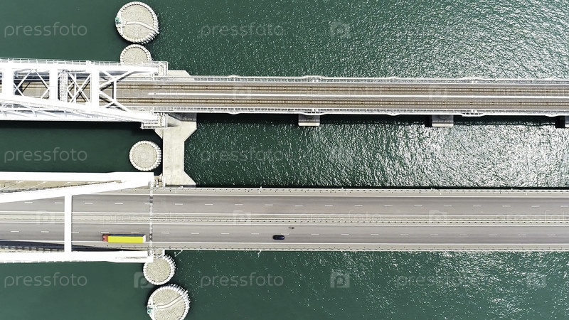 Вид на большой мост над зеленой рекой. идите вперед. большой белый мост с шоссе и мобильными автомобилями. красивая бирюзовая река от автомагистрали на мосту