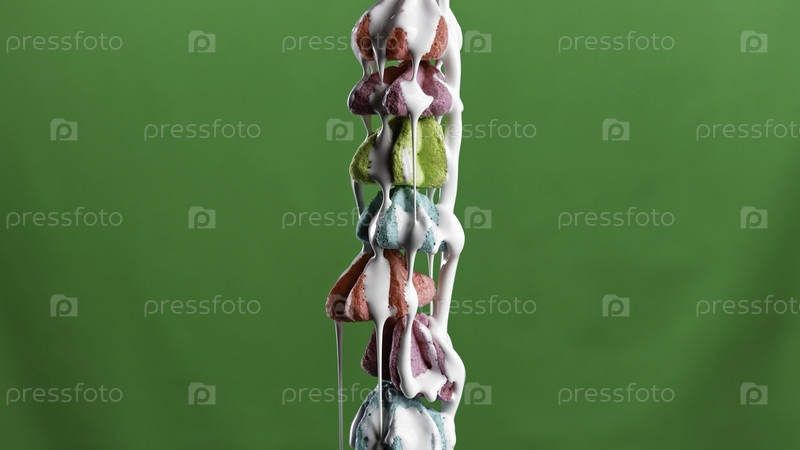 Закройте множество небольших меренгу на фоне зеленого хромированного ключа. Сток-клип. Лить белую глазуру на красочные торты с меренгом, кондитерская концепция