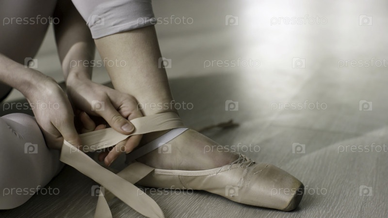 Близко к балерине, одетой в обувь для балета.Балерина носит пуйнт-офф, сидя на полу