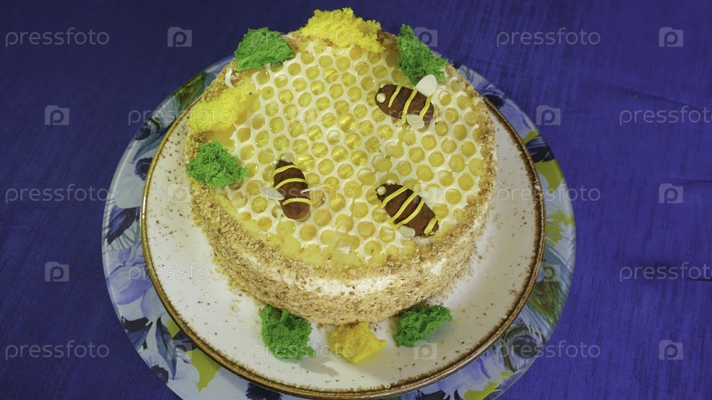 Красивый медовый торт, украшенный сливочными пчелами