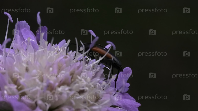 Экстремальная близость красивого фиолетового цветка с жуком на нем.Креативно.Цветущий бутон и насекомое на размытом зеленом фоне