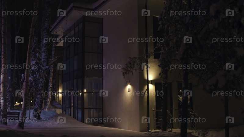 Фасад большого дома поздним зимним вечером освещается красочным мигающим светом аварийной машины. резервные кадры. вид на дачу в снежную зиму ночью