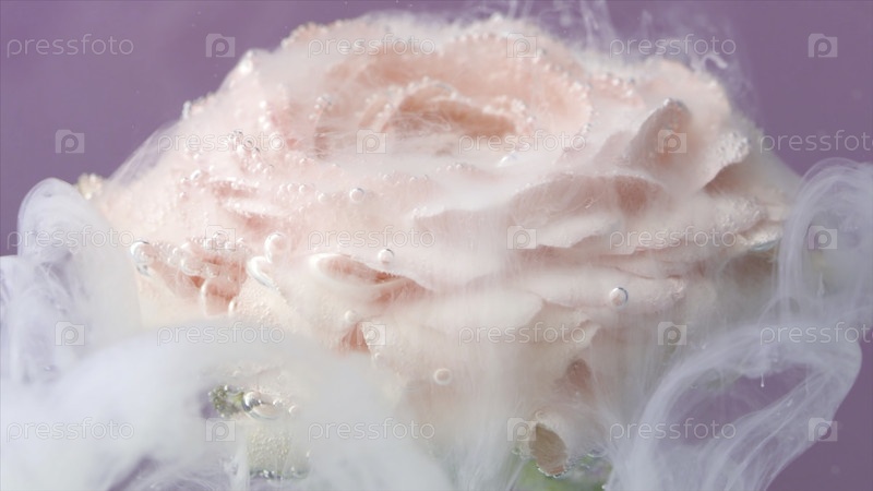 Живой цветок розы помещается под воду с медленным распространением и падением жидкого чернил. резервные кадры. Концепция цветочного искусства