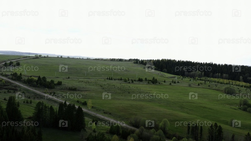 Тихий вид на провинциальный город рядом с лесом. Клип. Летний зеленый пейзаж с маленькими домами, садами и фермами и лесом со полями вокруг