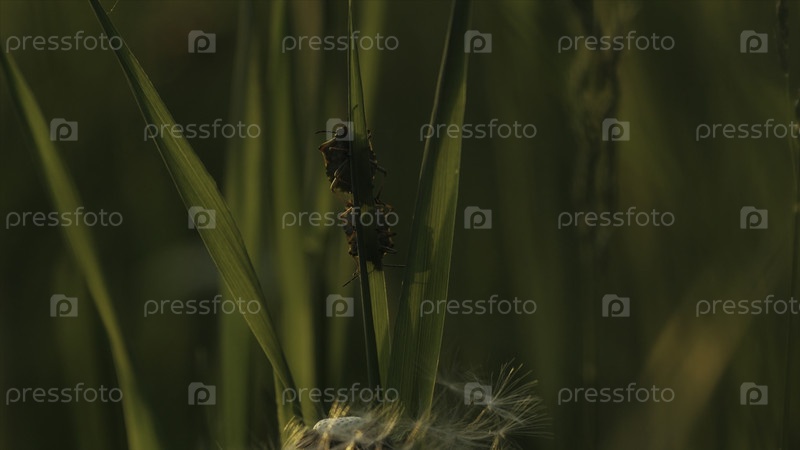 Закройте две клопы на стебле зеленого растения.Креативно.Природный ландшафт с насекомыми в траве